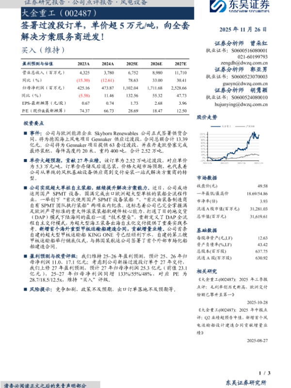 【东吴证券】【202511】签署过渡段订单,单价超5万元/吨,向全套解决方案服务商进发!-3页 证券期货研究报告