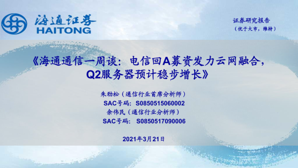 【海通证券】【20210321】海通通信一周谈:电信回A募资发力云网融合,Q2服务器预计稳步增长-10页 行业研究