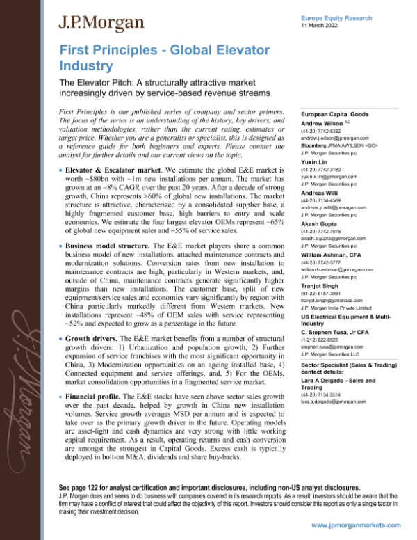 【J.P. Morgan】【20220311】J.P. 摩根-欧洲电梯行业-电梯推销:一个结构上具有吸引力的市场,越来越多地受到基于服务的收入流的驱动-128页 行业研究