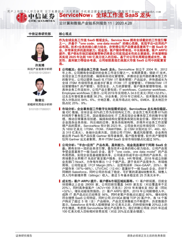 【中信证券】【20200428】科技行业云计算和数据产业链系列报告11:ServiceNow,全球工作流SaaS龙头-23页 行业研究