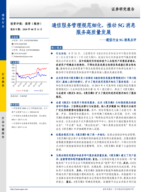 【长城证券】【20200831】通信行业5G消息点评:通信服务管理规范细化,推动5G消息服务高质量发展-3页 行业研究