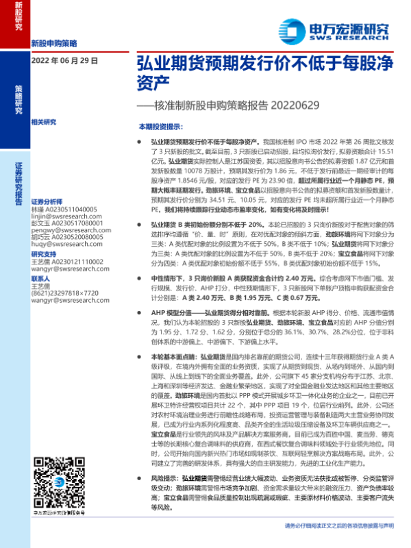 【申万宏源】【20220629】核准制新股申购策略报告:弘业期货预期发行价不低于每股净资产-16页 行业研究