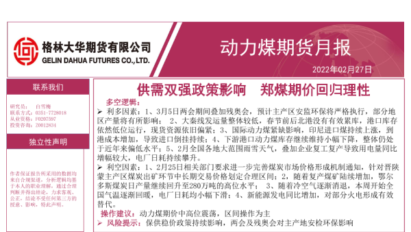 【格林大华期货】【20220227】动力煤期货月报:供需双强政策影响,郑煤期价回归理性-20页 行业研究