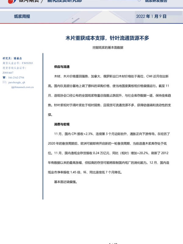 【银河期货】【20220109】挖掘纸浆的基本面数据:木片重获成本支撑,针叶流通货源不多-68页 行业研究