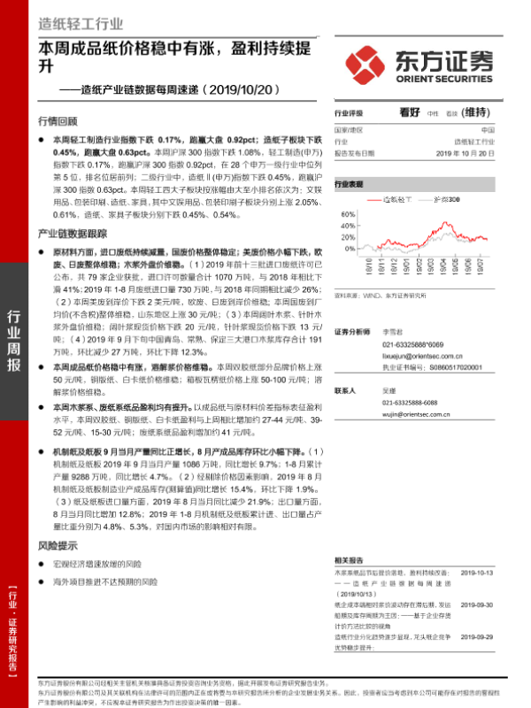 【东方证券】【20191020】20191020-东方证券-造纸产业链数据每周速递:本周成品纸价格稳中有涨,盈利持续提升-14页 行业研究