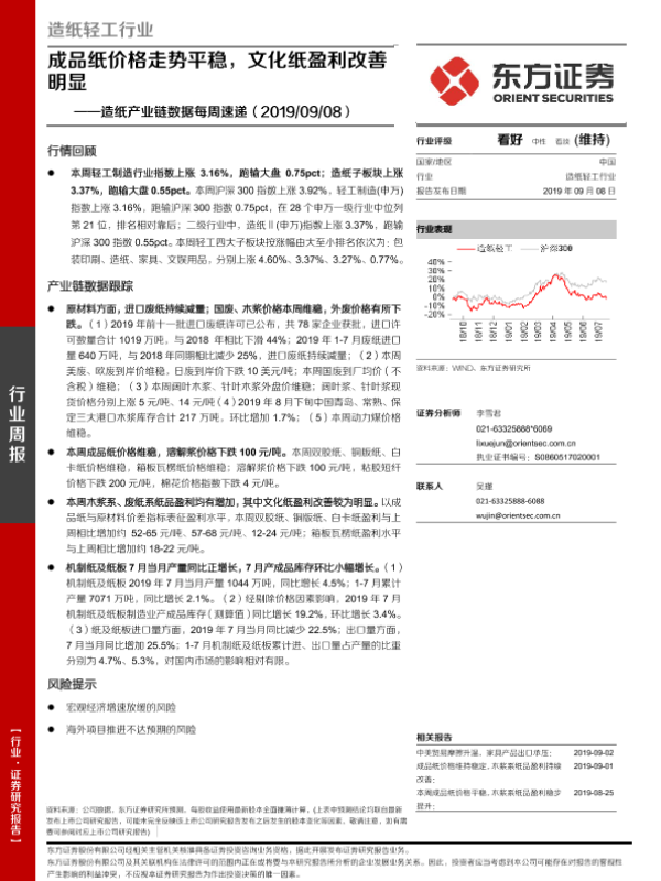 【东方证券】【20190908】20190908-东方证券-造纸产业链数据每周速递:成品纸价格走势平稳,文化纸盈利改善明显-14页 行业研究