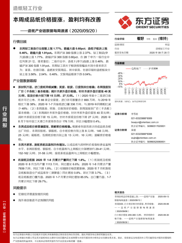 【东方证券】【20200920】20200920-东方证券-造纸产业链数据每周速递:本周成品纸价格提涨,盈利均有改善-15页 行业研究