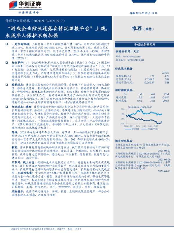 【华创证券】【20210919】20210919-华创证券-传媒行业周观察:“游戏企业防沉迷落实情况举报平台”上线,未成年人保护不断加强-22页 行业研究