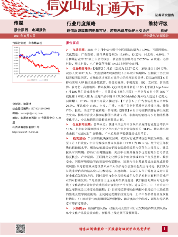 【山西证券】【20210805】传媒行业月度策略:疫情反弹或影响电影市场,游戏未成年保护再引关注-24页 行业研究