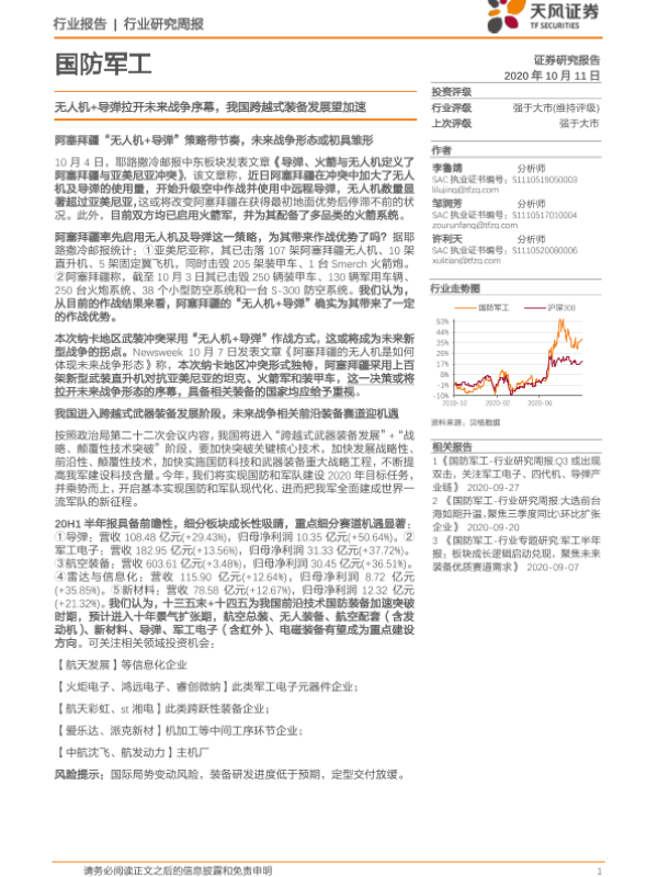 【天风证券】【20201011】国防军工行业研究周报:无人机+导弹拉开未来战争序幕,我国跨越式装备发展望加速-2页 行业研究