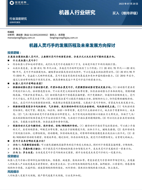 【国金证券】【20230720】机器人行业研究:机器人灵巧手的发展历程及未来发展方向探讨-20页 行业研究