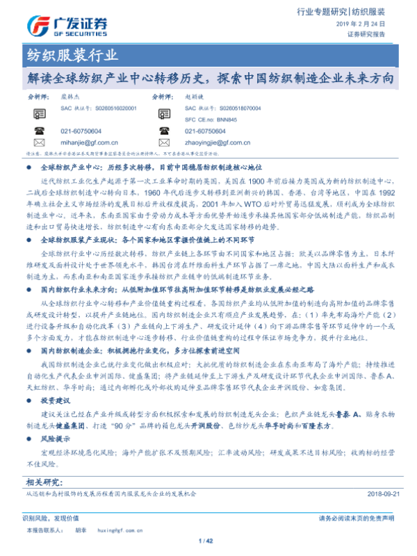 【广发证券】【20190224】解读全球纺织产业中心转移历史,探索中国纺织制造企业未来方向-42页 行业研究