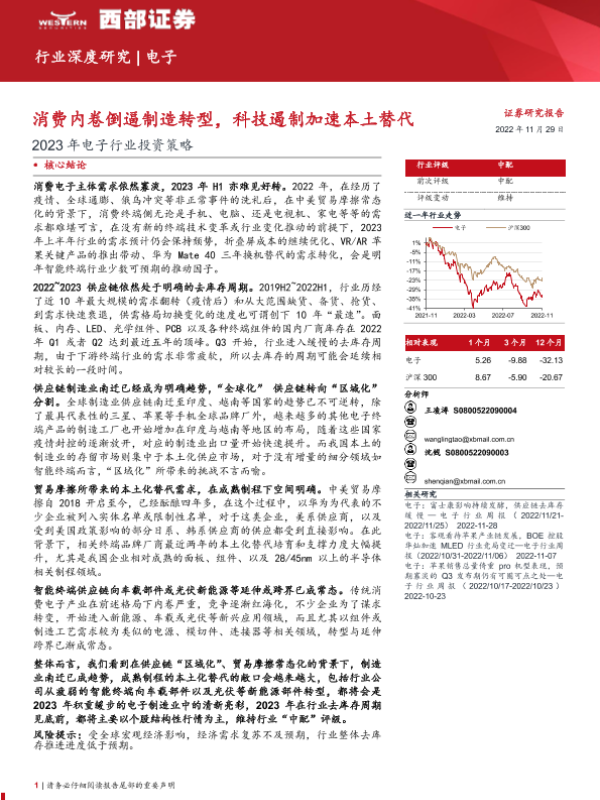 【西部证券】【20221129】2023年电子行业投资策略:消费内卷倒逼制造转型,科技遏制加速本土替代-24页 行业研究