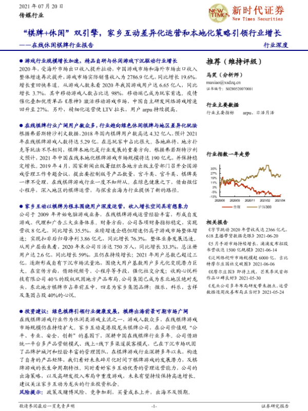 【新时代证券】【20210720】在线休闲棋牌行业报告:“棋牌+休闲”双引擎,家乡互动差异化运营和本地化策略引领行业增长-24页 行业研究