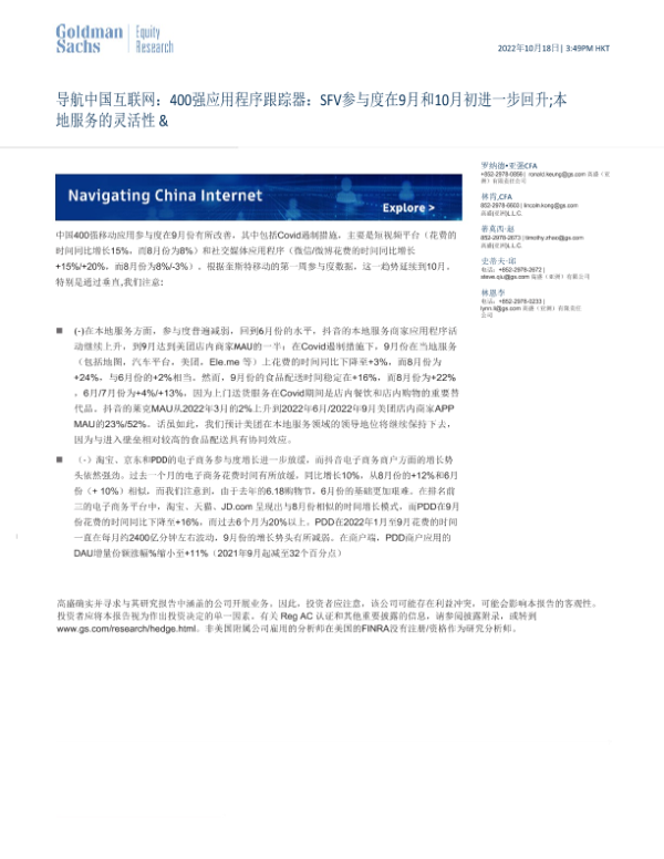 【Goldman Sachs】【20221018】导航中国互联网行业:400强应用程序跟踪器,SFV参与度在9月和10月初进一步回升;本地服务的灵活性-20页 行业研究