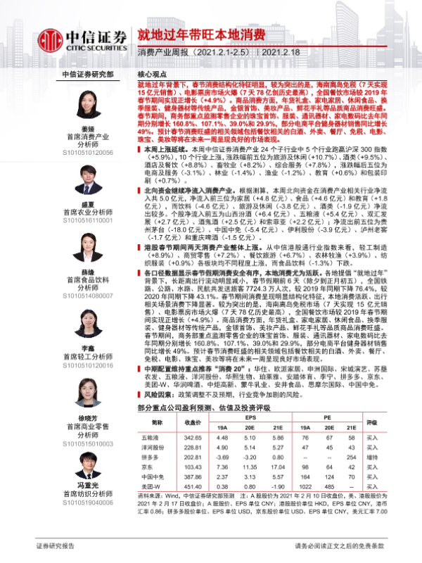 【中信证券】【20210218】消费产业周报:就地过年带旺本地消费-11页 行业研究