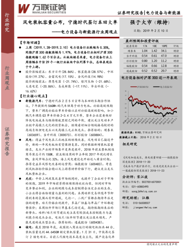 【万联证券】【20190210】电力设备与新能源行业周观点:风电装机容量公布,宁德时代签订本田大单-16页 行业研究
