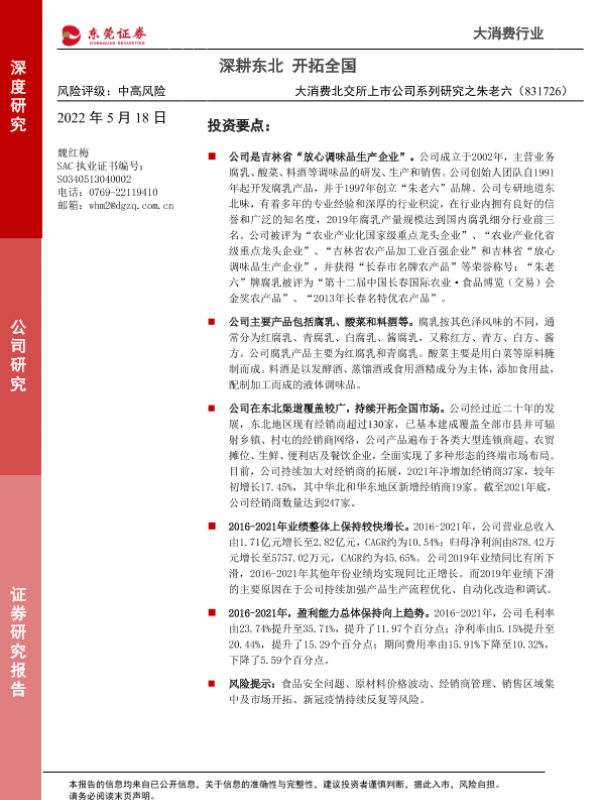 【东莞证券】【20220518】大消费北交所上市公司系列研究之朱老六(831726):深耕东北 开拓全国-17页 行业研究
