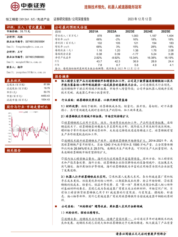 【中泰证券】【20231212】连铸技术领先,机器人减速器隐形冠军-23页 行业研究