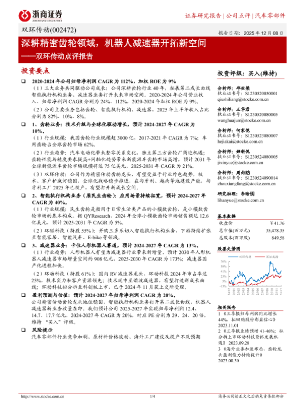 【浙商证券】【202512】深耕精密齿轮领域,机器人减速器开拓新空间——双环传动点评报告-4页 证券期货研究报告