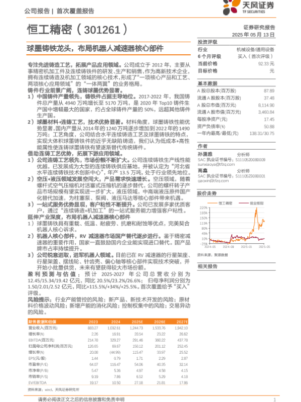 【天风证券】【20250513】恒工精密(301261)球墨铸铁龙头,布局机器人减速器核心部件-21页 证券期货研究报告