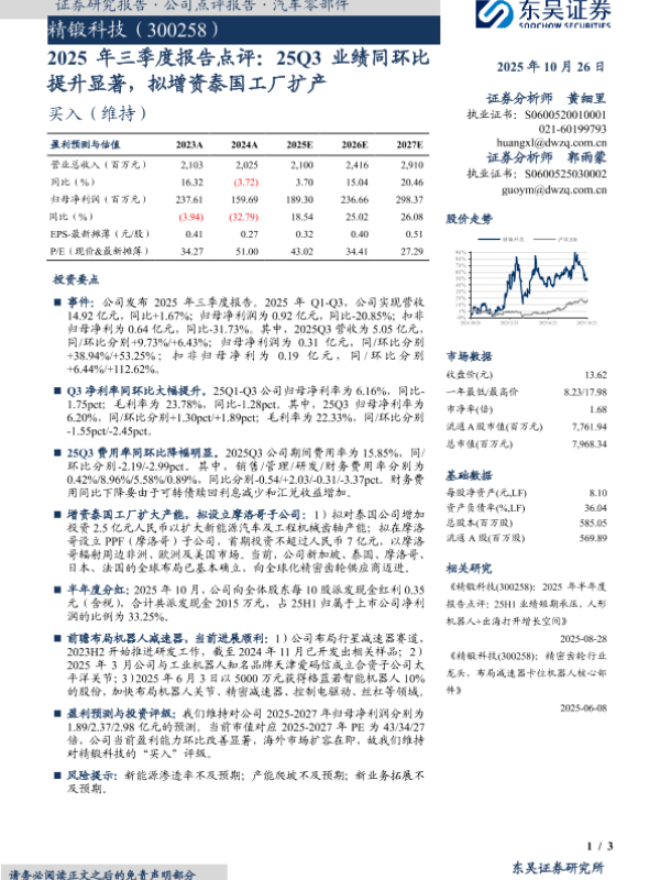 【东吴证券】【202510】2025年三季度报告点评:25Q3业绩同环比提升显著,拟增资泰国工厂扩产-3页 证券期货研究报告