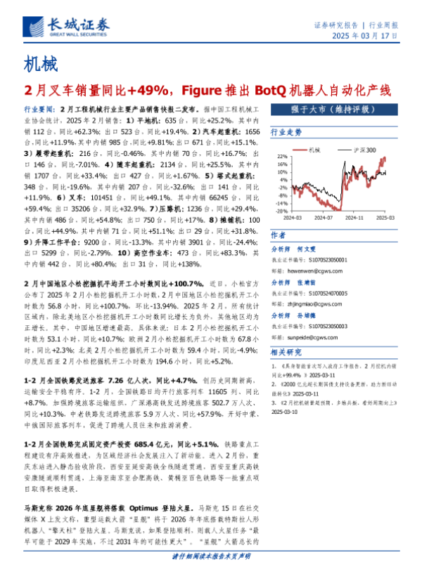 【长城证券】【20250317】机械行业周报:2月叉车销量同比+49%,Figure推出BotQ机器人自动化产线-14页 证券期货研究报告