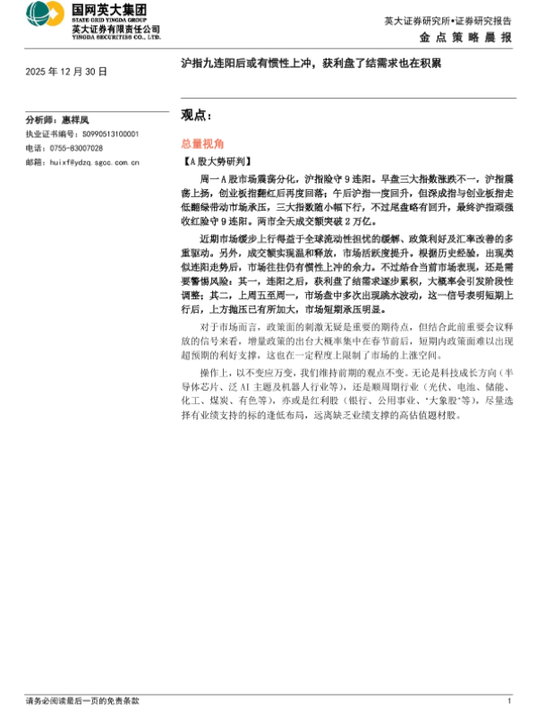 【英大证券】【202512】金点策略晨报:沪指九连阳后或有惯性上冲,获利盘了结需求也在积累-4页 证券期货研究报告