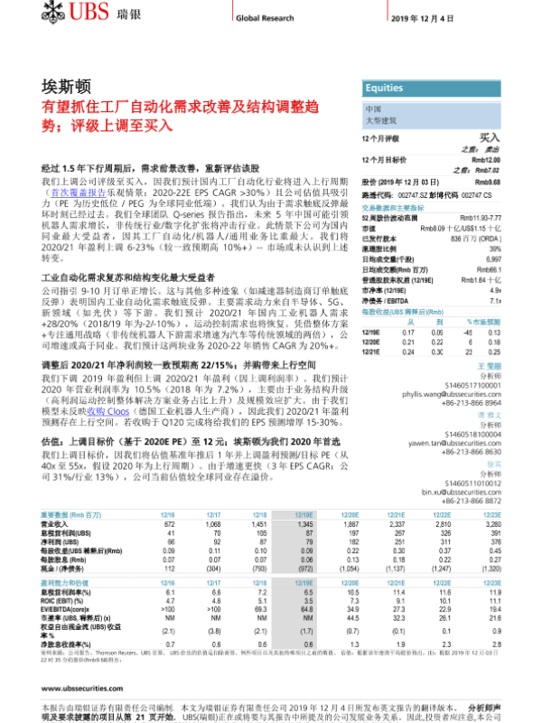 【瑞银证券有限责任公司】【20191204】埃斯顿-002747.SZ-有望抓住工厂自动化需求改善及结构调整趋势;评级上调至买入-26页 行业研究