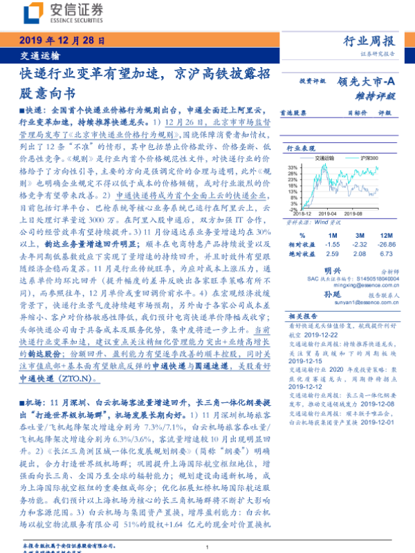 【安信证券】【20191228】交通运输行业周报:快递行业变革有望加速,京沪高铁披露招股意向书-19页 行业研究