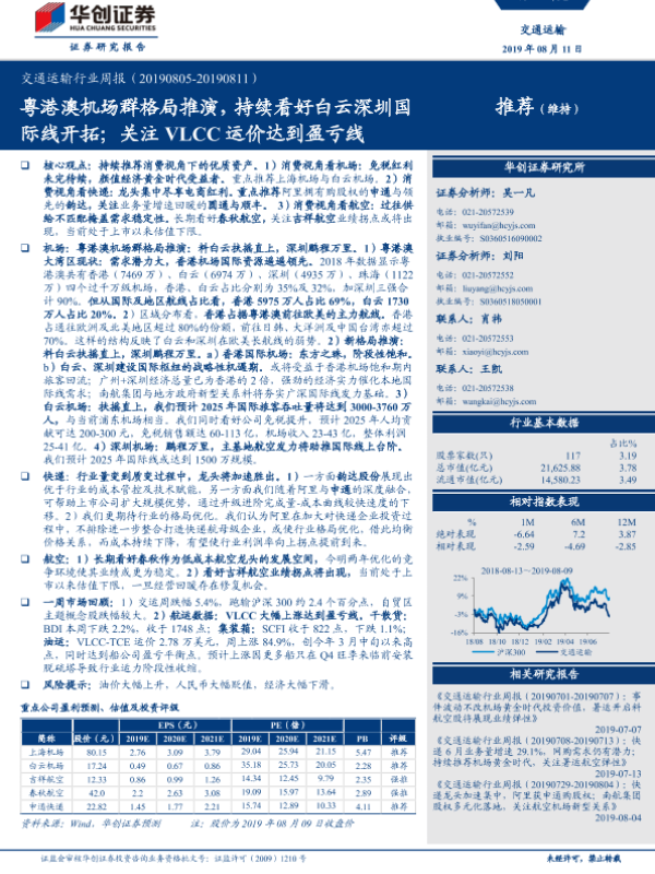 【华创证券】【20190811】交通运输行业周报:粤港澳机场群格局推演,持续看好白云深圳国际线开拓;关注VLCC运价达到盈亏线-11页 行业研究