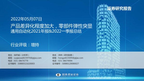 【国泰君安证券】【20220507】通用自动化2021年报&2022一季报总结:产品差异化程度加大,零部件弹性突显-33页 行业研究