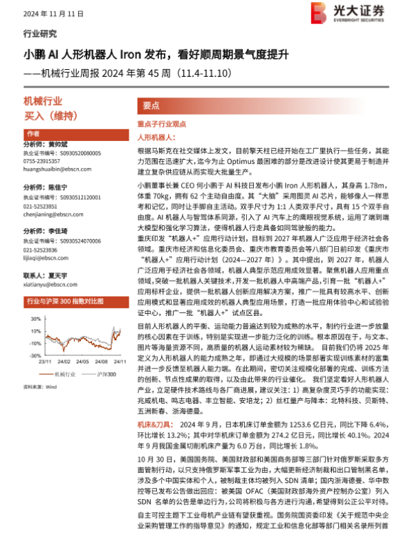 【光大证券】【20241111】2024年第45周机械行业周报:小鹏AI人形机器人Iron发布,看好顺周期景气度提升-12页 行业研究
