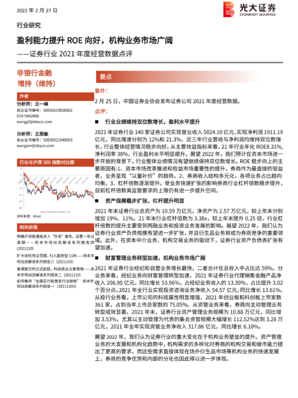 【光大证券】【20220227】证券行业2021年度经营数据点评:盈利能力提升ROE向好,机构业务市场广阔-3页 行业研究