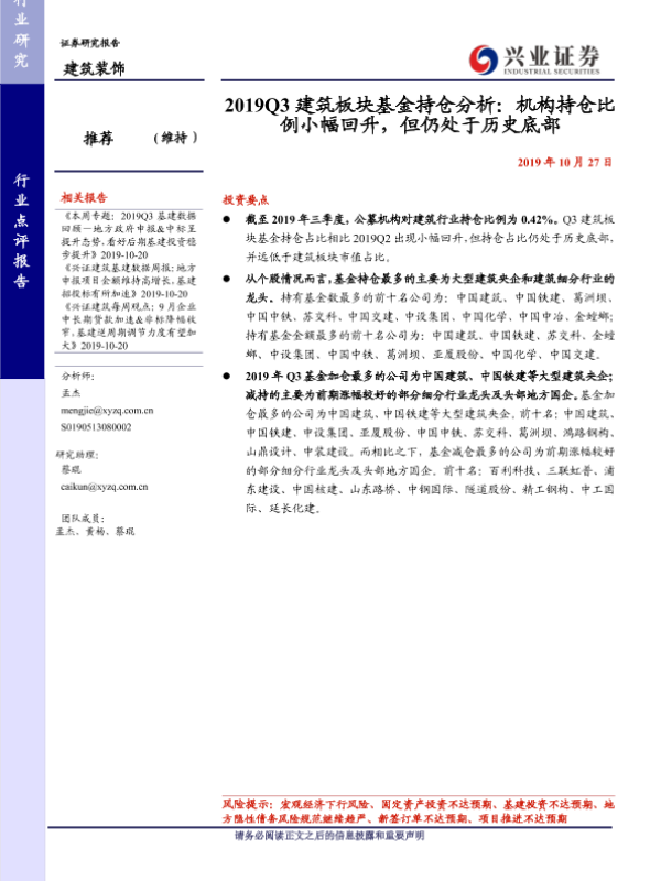 【兴业证券】【20191027】2019Q3建筑板块基金持仓分析-4页 行业研究