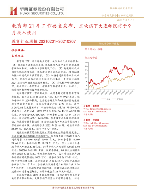 【华西证券】【20210207】教育行业周报:教育部21年工作要点发布,东软旗下大连学院将于9月投入使用-18页 行业研究