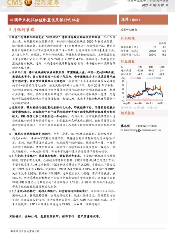 【海通证券】【20210801】8月银行策略:回调带来较低估值配置优质银行之机会-2页 证券期货研究报告