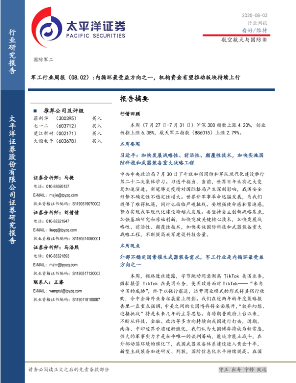 【太平洋证券】【20200802】军工行业周报:内循环最受益方向之一,机构资金有望推动板块持续上行-21页 行业研究