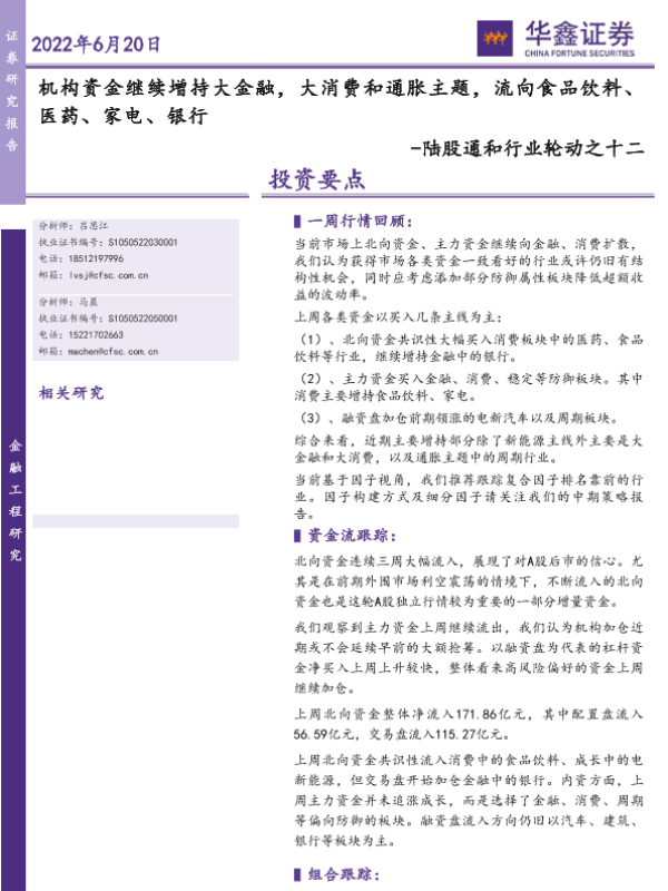 【华鑫证券】【20220620】陆股通和行业轮动之十二:机构资金继续增持大金融,大消费和通胀主题,流向食品饮料、医药、家电、银行-18页 行业研究