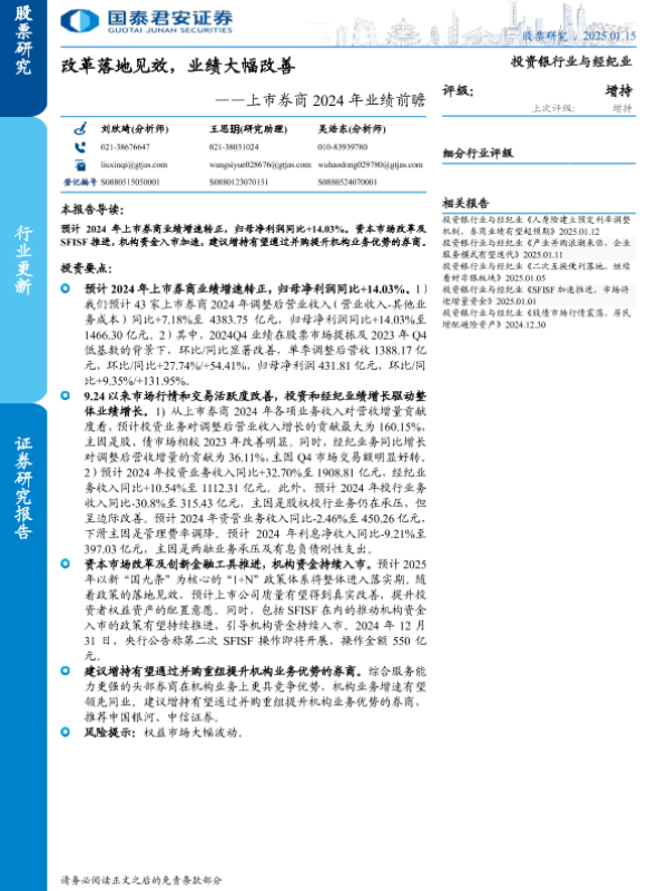 【国泰君安证券】【20250115】投资银行业与经纪业行业上市券商2024年业绩前瞻:改革落地见效,业绩大幅改善-10页 行业研究