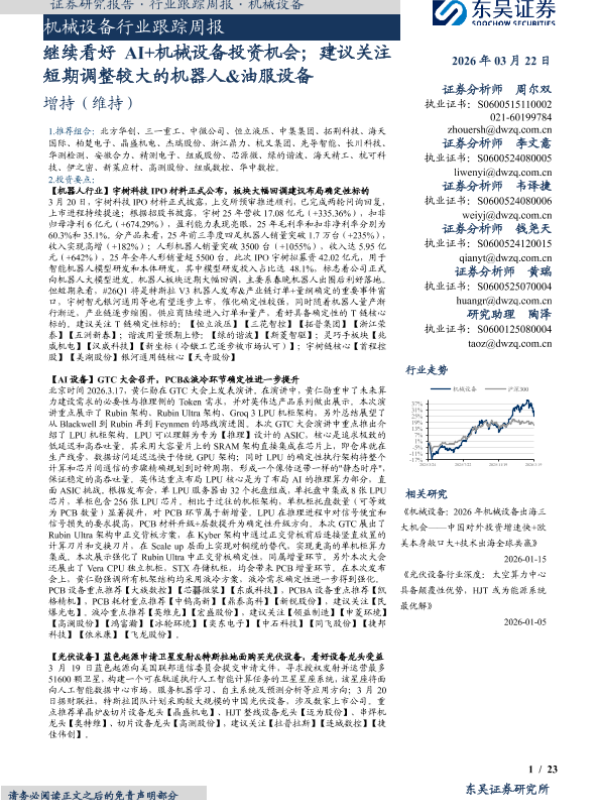 【东吴证券】【202603】继续看好AI+机械设备投资机会;建议关注短期调整较大的机器人&油服设备-23页 证券期货研究报告