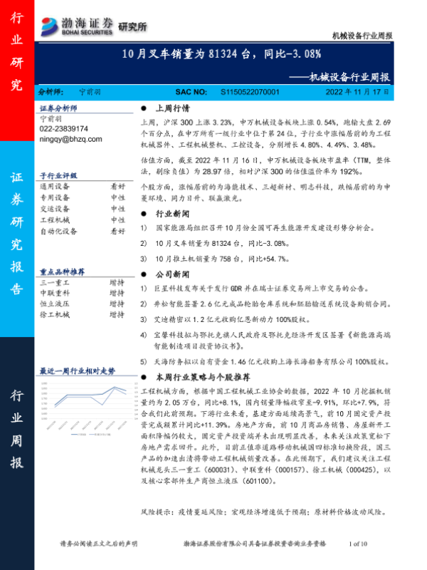 【渤海证券】【20221117】20221117-渤海证券-机械设备行业周报:10月叉车销量为81324台,同比-3.08%-10页 行业研究