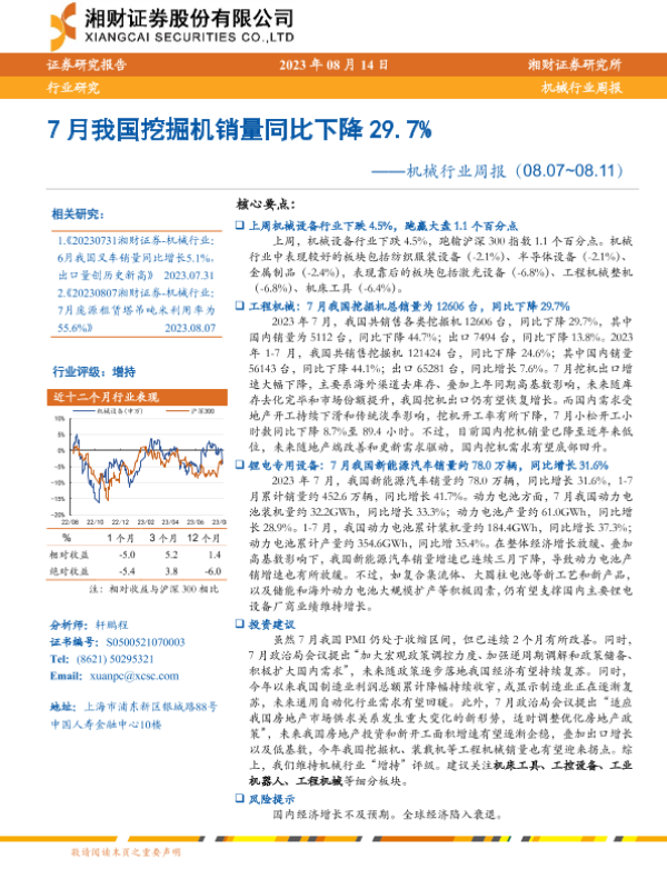【湘财证券】【20230814】20230814-湘财证券-机械行业周报:7月我国挖掘机销量同比下降29.7%-13页 行业研究