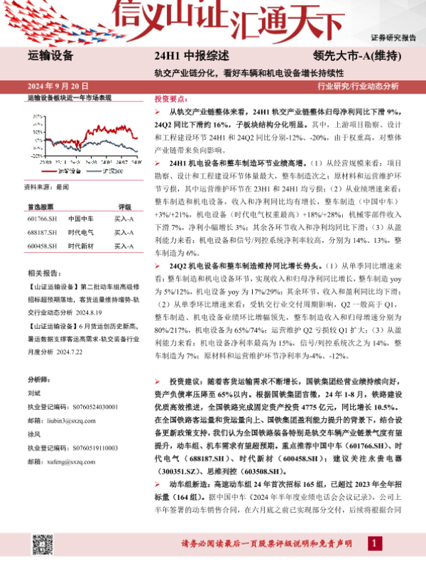 【山西证券】【20240920】运输设备行业24H1中报综述:轨交产业链分化,看好车辆和机电设备增长持续性-20页 行业研究