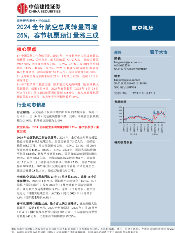 【中信建投证券】【20250112】2025年01月23日更新-【中信建投】航空机场行业动态:2024全年航空总周转量同增25%,春节机票预订量涨三成-20页 行业研究