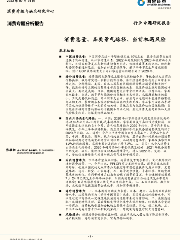 【国金证券】【20220731】消费专题分析报告:消费总量、品类景气路径、当前机遇风险-21页 行业研究