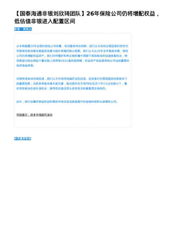 【国泰海通非银刘欣琦团队】【202603】26年保险公司仍将增配权益,低估值非银进入配置区间-3页 证券期货研究报告