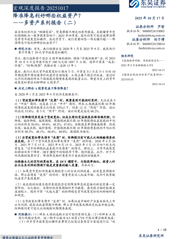 【东吴证券】【202510】降准降息利好哪些权益资产?——多资产系列报告(二)-15页 证券期货研究报告