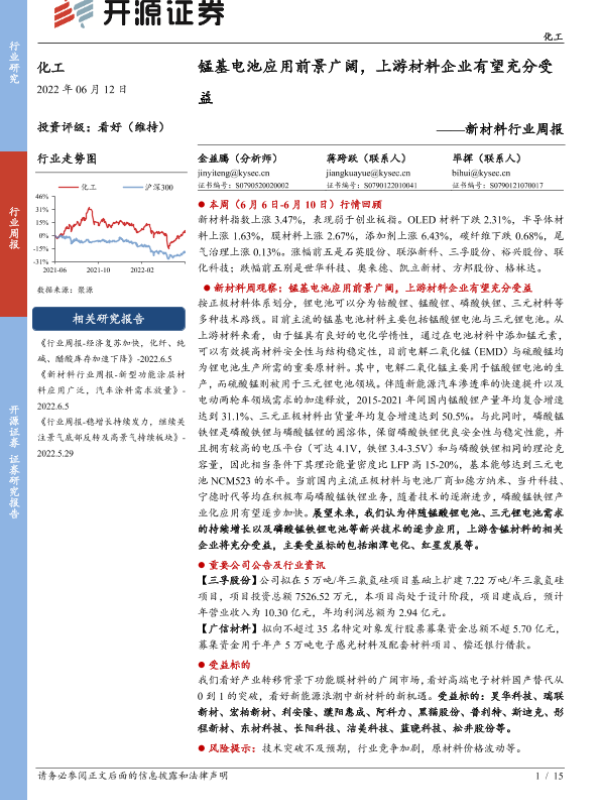 【开源证券】【20220612】20220612-开源证券-新材料行业周报:锰基电池应用前景广阔,上游材料企业有望充分受益-15页 行业研究