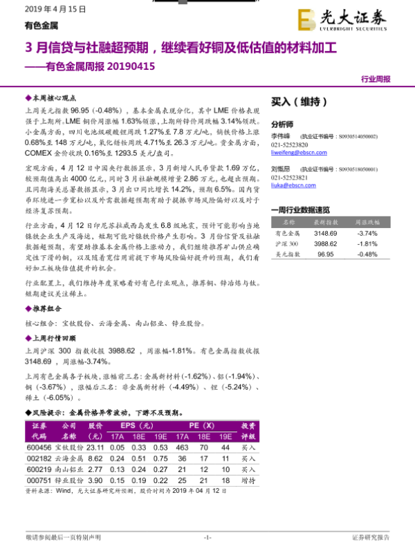 【光大证券】【20190415】20190415-光大证券-有色金属周报:3月信贷与社融超预期,继续看好铜及低估值的材料加工-13页 行业研究